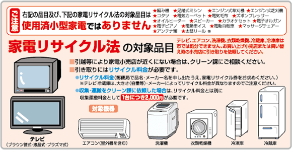 エアコン、ブラウン管テレビ・液晶テレビ・プラズマテレビ、冷蔵庫・冷凍庫、洗濯機・衣類乾燥機の排出方法は家電リサイクル法に基づいた処分が必要となります。